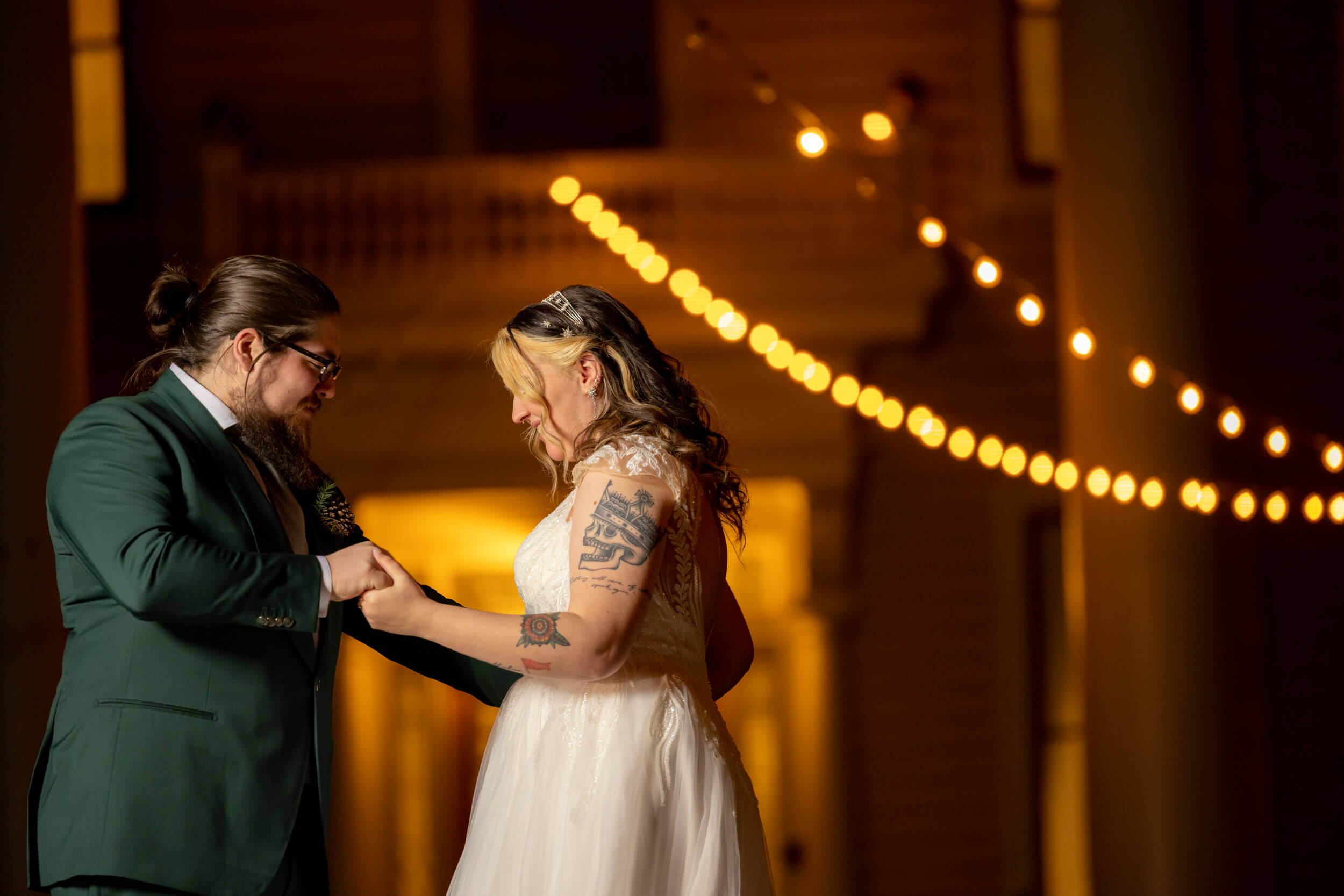 In winter, the days are short. The gold lights at the main entrance are breathtaking and their curve creates an enticing wedding portrait. Brides and grooms gain an intimate moment together for photos under the string lights.