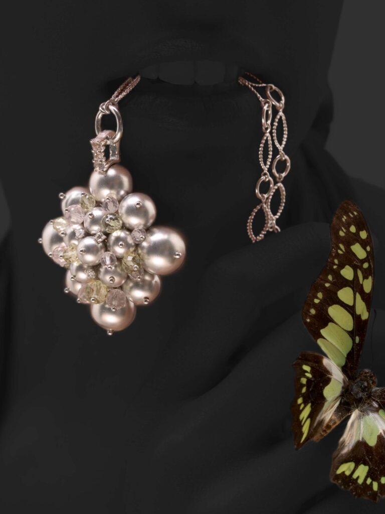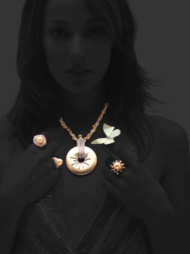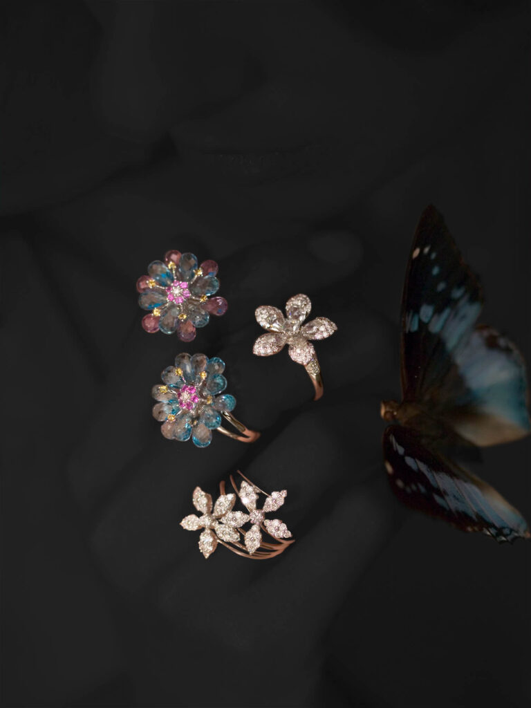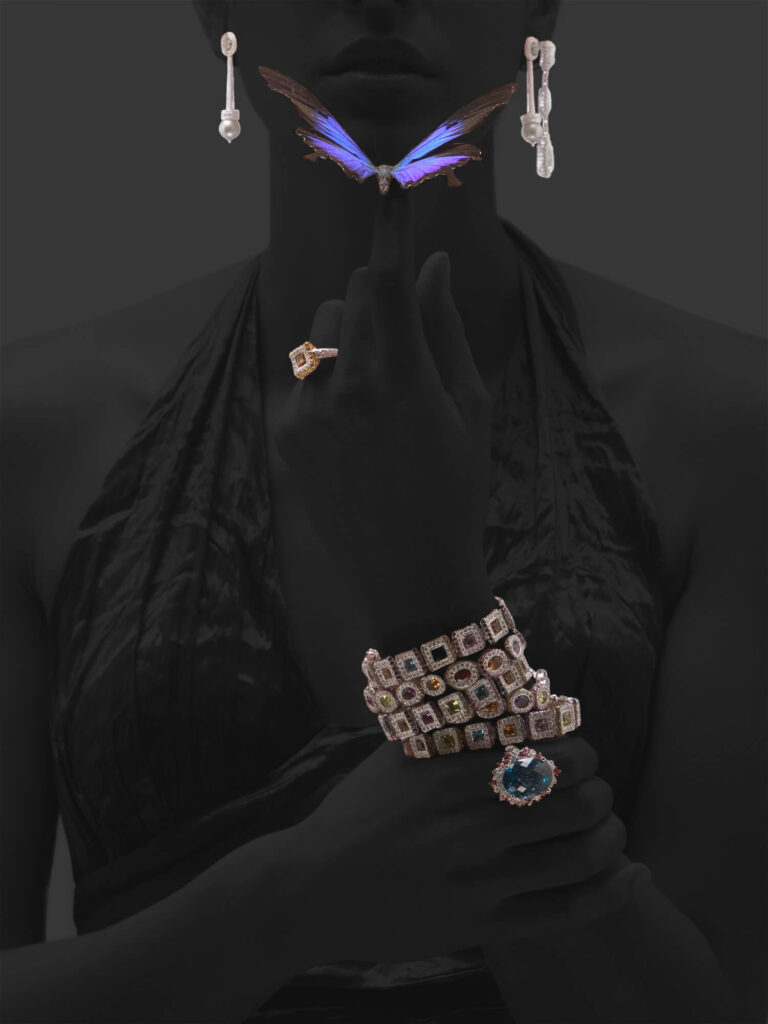 Our studio implements the insects into luxurious jewelry photography. The portraits showcase diamond earrings, silver bracelets, flower-shaped rings, and gold necklaces.