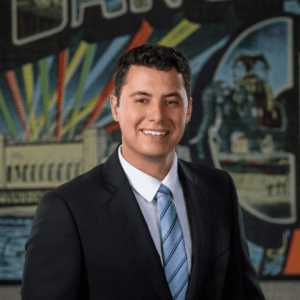 corporate headshot photography of man in blue suit against orange background