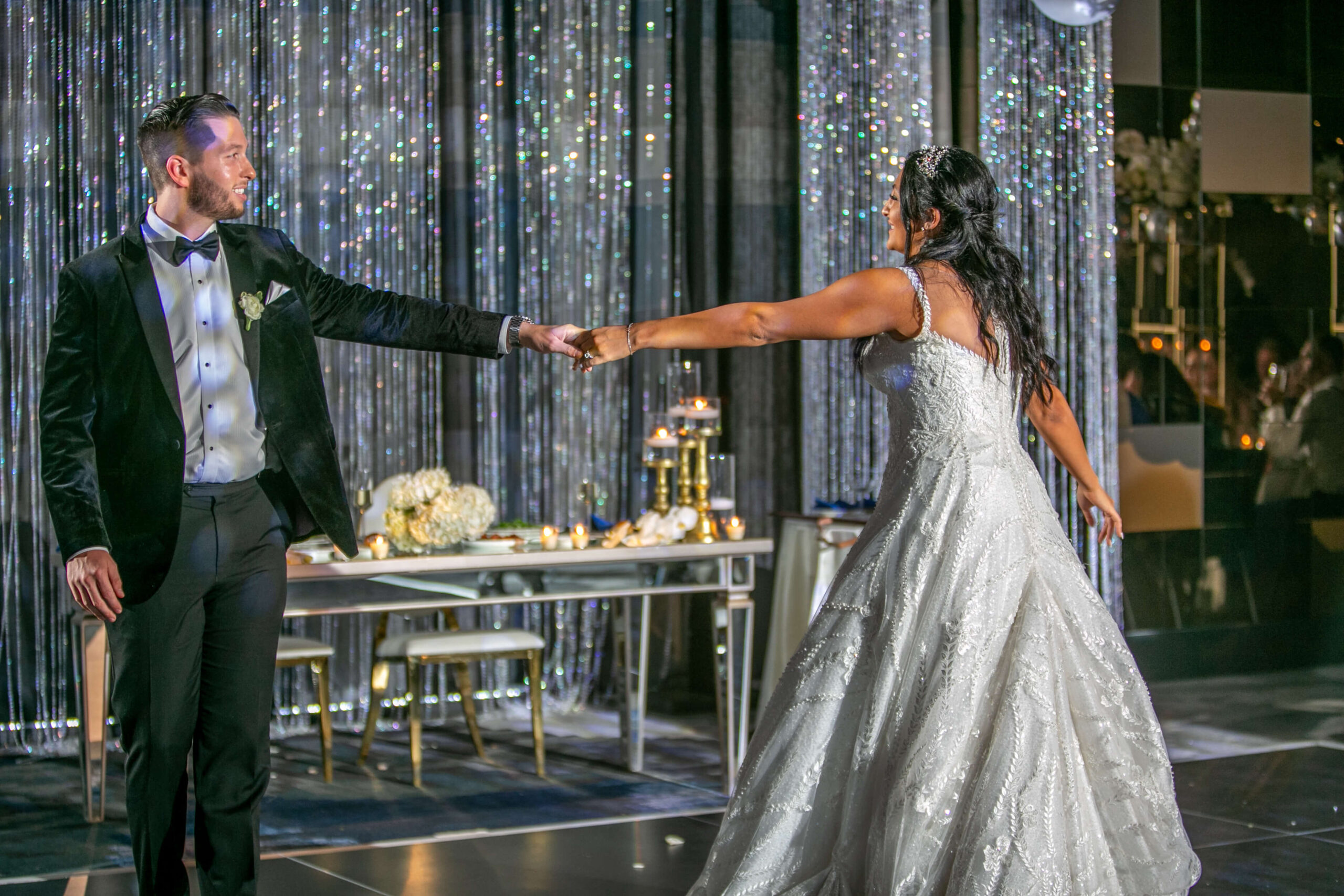 W Philadelphia is a glamorous venue for stunning wedding photography and partying on the dance floor. This grand ballroom features reflective disco balls, clusters of balloon, and elegant floral centerpieces. Many wedding couples are drawn to the modern elegance of this hotel.